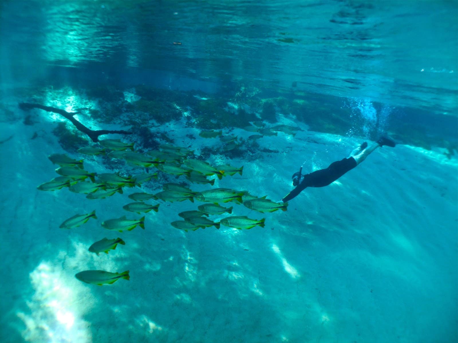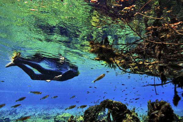 Excelente para quem quer experimentar a sensação de mergulhar com equipamento scuba em meio a cardumes de peixes no impressionante cenário do Rio Formoso, que se caracteriza pelos troncos submersos e formações calcárias, além da sensação de estar dentro de uma garrafa de champagne quando estiver embaixo da cachoeira. Todo o percurso de aprox. 300m. É acompanhado por um instrutor e tem duração mínima de 30 minutos dentro d’água a uma profundidade média de 4m. Este mergulho agrada inclusive os mais experientes, pelo visual diferente do mar e também pela transparência da água.